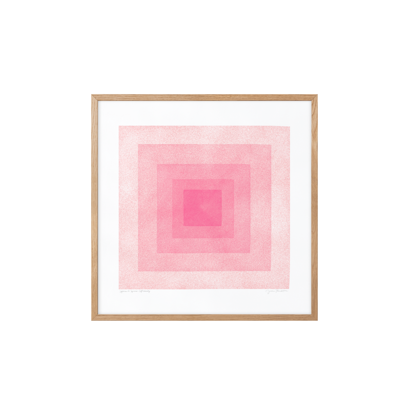 Kunstplakaten: “Soft Geometry: Squares In Squares, Blush” af kunstnerne Jessica Pundstone er en grafisk illustreret plakat, der er eksklusivt lavet til Peléton. Det har været betydningsfuldt for dem, at plakaten står til fri fortolkning. Dette værk er en del af en samling af eksklusive kunstplakater, der udtrykker minimalisme og enkelhed.