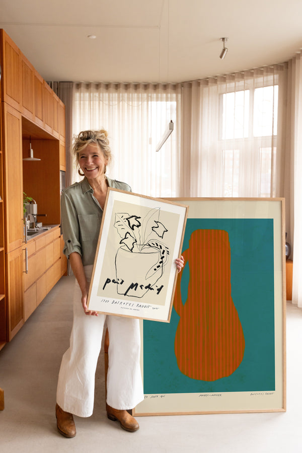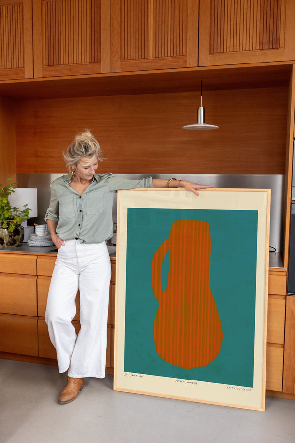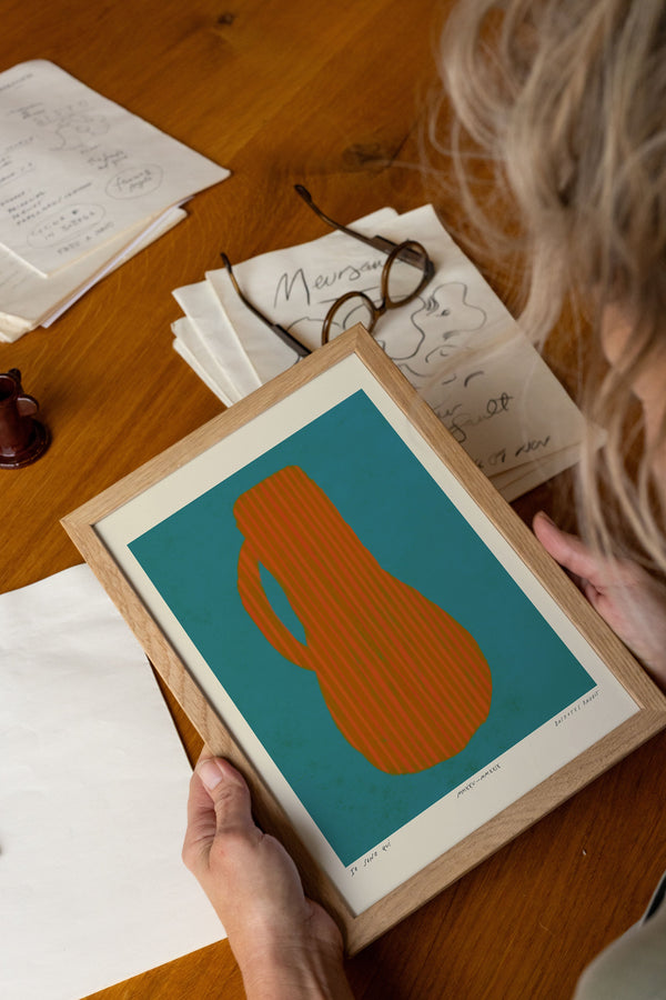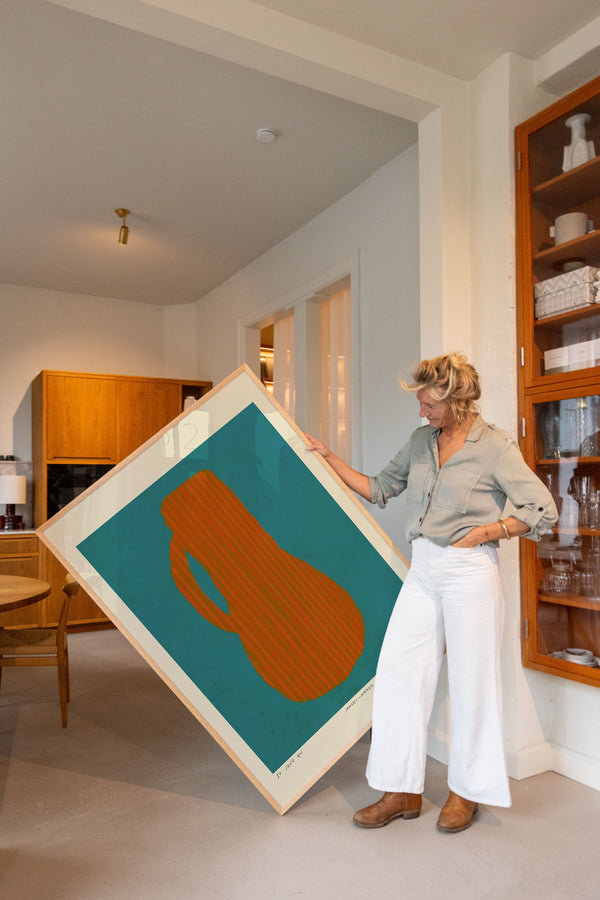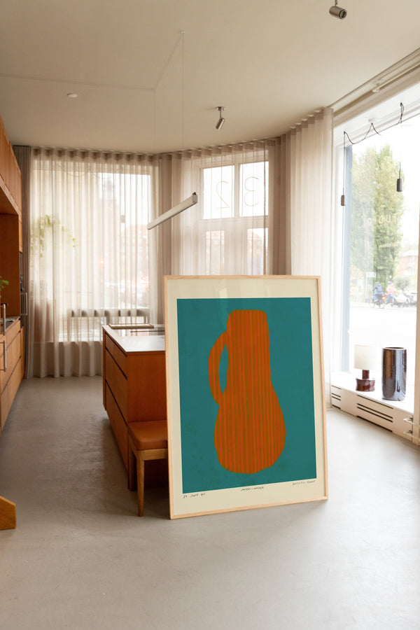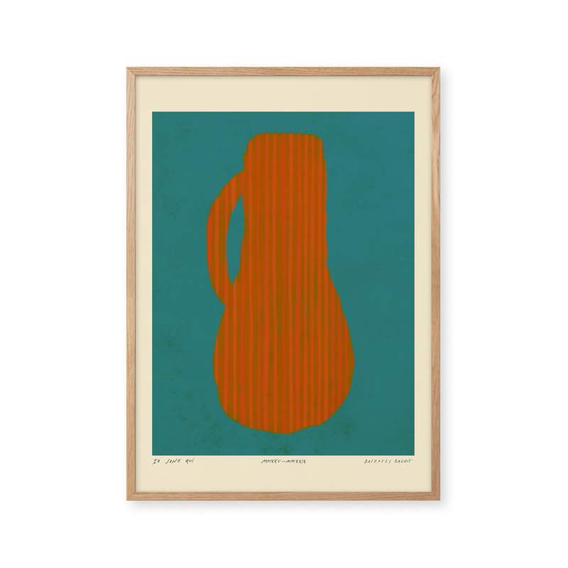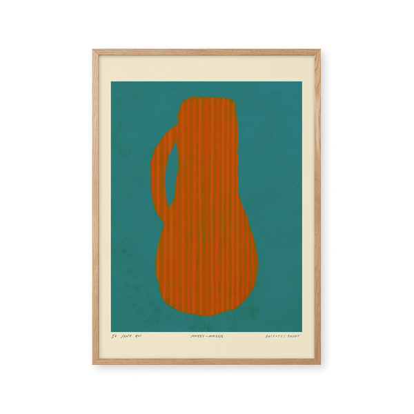 Kunstplakaten: "Vase, Turquise” er skabt af kunstneren Das Rotes Rabbit og er en del af en kunstserie eksklusivt lavet til Peléton. Serien har karakter og personlighed og fungerer perfekt som et statement piece eller i samspil med de øvrige værker i serien. Farverne og den minimalistiske stil smelter sammen og skaber et harmonisk udtryk, der tilføjer dybde og elegance til ethvert rum.