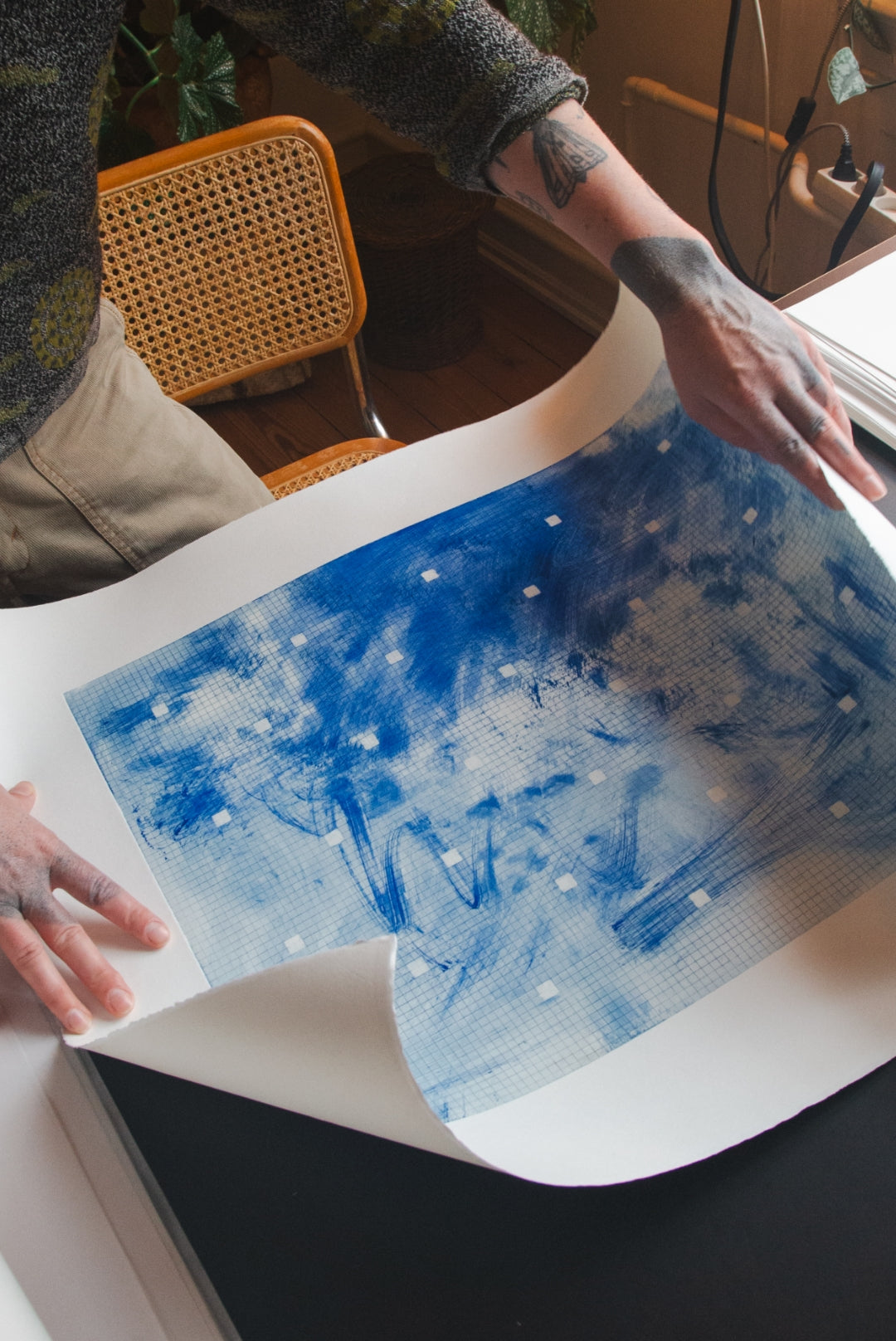 In the series of monotype prints, Julie takes her starting point in the squared mathematics notebook. Here, the grid functions as a set of rules for systematics and repetition, but the repetitions are used to open a freer, more dreamy space. The stringent pattern, etched into the copper plate, contrasts with the deep and soft colors of the applied printing ink, creating a tension between the tight and the lively.