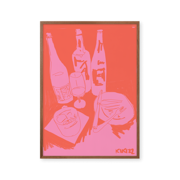 The art poster: "Paris" by the artist Kiki Makes is an illustrated poster curated for Peléton. The poster is inspired by a meal that Kiki and her sister shared at their favorite place in Paris, Aux Deux Amis. The waiters served them their favorite amaro, a glass of sherry, and a plate of anchovies served in olive oil. This work was created digitally using minimalist colors and lines.
