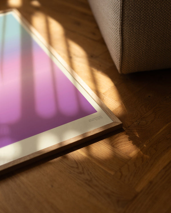 Our frames are made from high-quality materials and are available in solid oak, dark-stained oak, and black-painted pine. All frames come with real glass, while the largest sizes (70 × 100 cm and 100 × 140 cm) feature 2 mm acrylic glass, which looks like glass but is lighter and more shatter-resistant (durable).